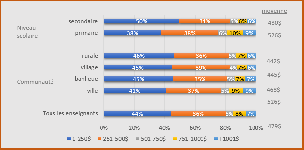 Le graphique qui suit montre aussi qu’en moyenne, les enseignants des villes (526 $) dépensent plus que leurs collègues des banlieues (468 $), des villages (445 $) et des milieux ruraux (442 $). Les enseignants des villes étaient aussi plus nombreux (9 %) à dépenser une somme supérieure à 1 000 $ en comparaison avec les autres communautés (7 %, 6 % et 6 %).