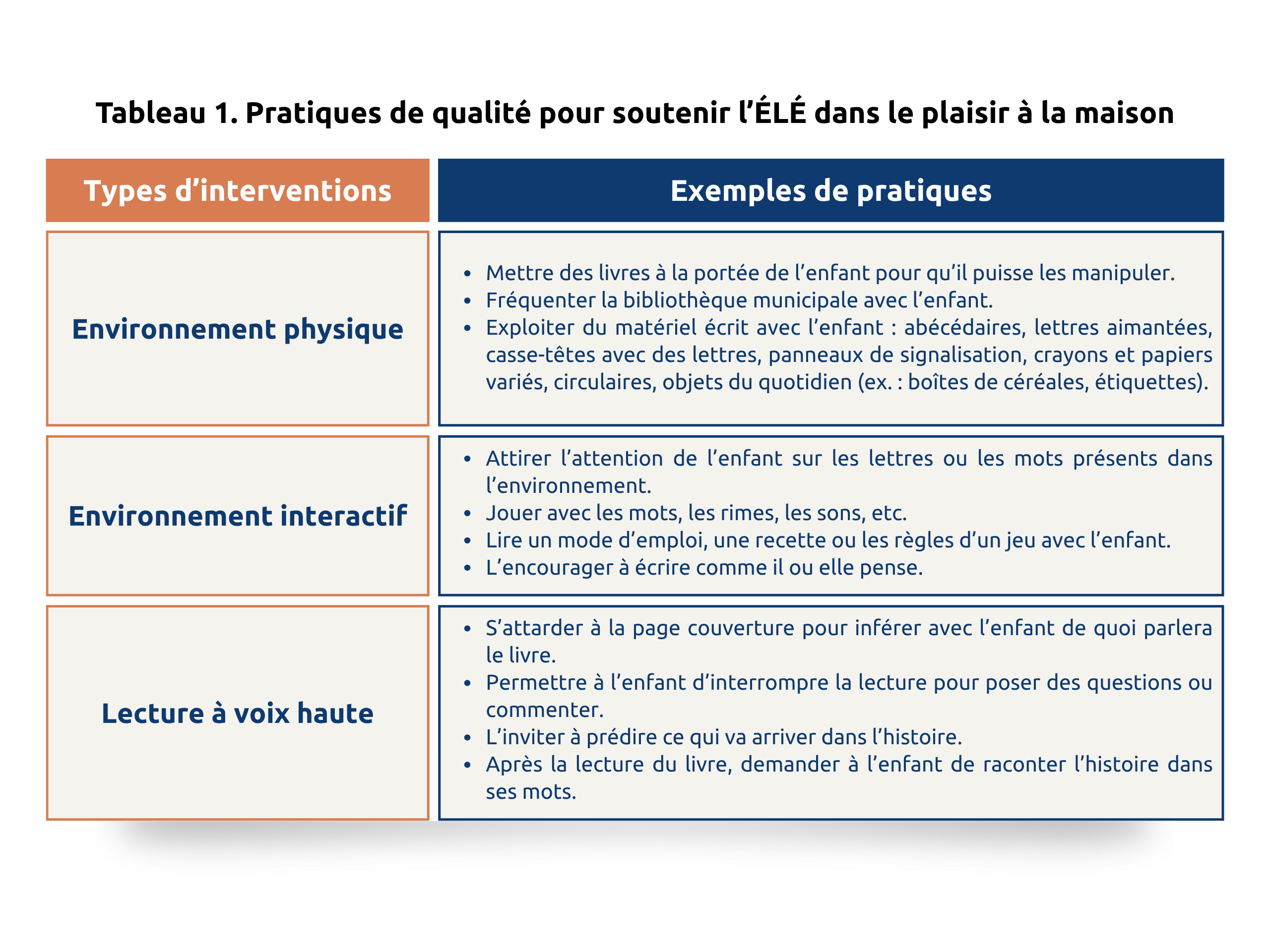 Pendant 21 semaines, les parents ont reçu une trousse littéraire différente à exploiter avec leur enfant. Celle-ci était constituée d’un livre (ex. : récit, documentaire, livre-jeu, abécédaire) dans lequel des rabats avaient été insérés pour rendre la lecture interactive (ex. : questions d’inférence, de réaction, de réflexion), ainsi que d’un livret qui présentait des interventions à faire avant, pendant et après la lecture. Du matériel ludique était également fourni (ex. : marottes pour rejouer l’histoire, cartes de devinettes, jeux de conscience phonologique, jeux invitant l’enfant à écrire de façon spontanée ou à dicter un texte à son parent). Les parents étaient aussi invités à participer à l’école de leur enfant à quatre ateliers animés par l’équipe de recherche au cours desquels des interventions de qualité en lien avec l’ÉLÉ leur étaient présentées. Le tableau 1 regroupe certaines de ces interventions.